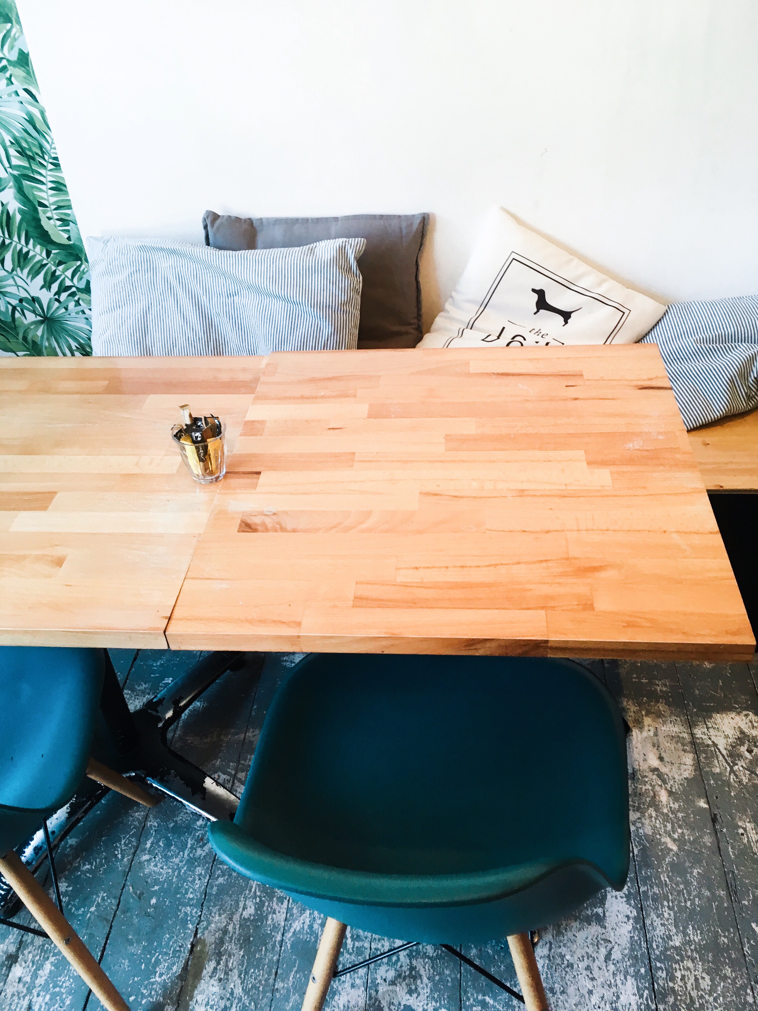 Every wallpaper picked for the Long Dog locations is spot on. My personal favourite was this art-deco style in the boutique next to the counter, followed but the leaf print in the café which is similar to the bedding that I had at uni (to be seen in an upcoming post). Overall the aesthetic is right up my street, with plants covering the walls of the café and an array of cushions, including a few that were personalised. The layout of the café has been slightly different each time I have visited but the counter is always set against a backdrop of gorgeous dark tiles.