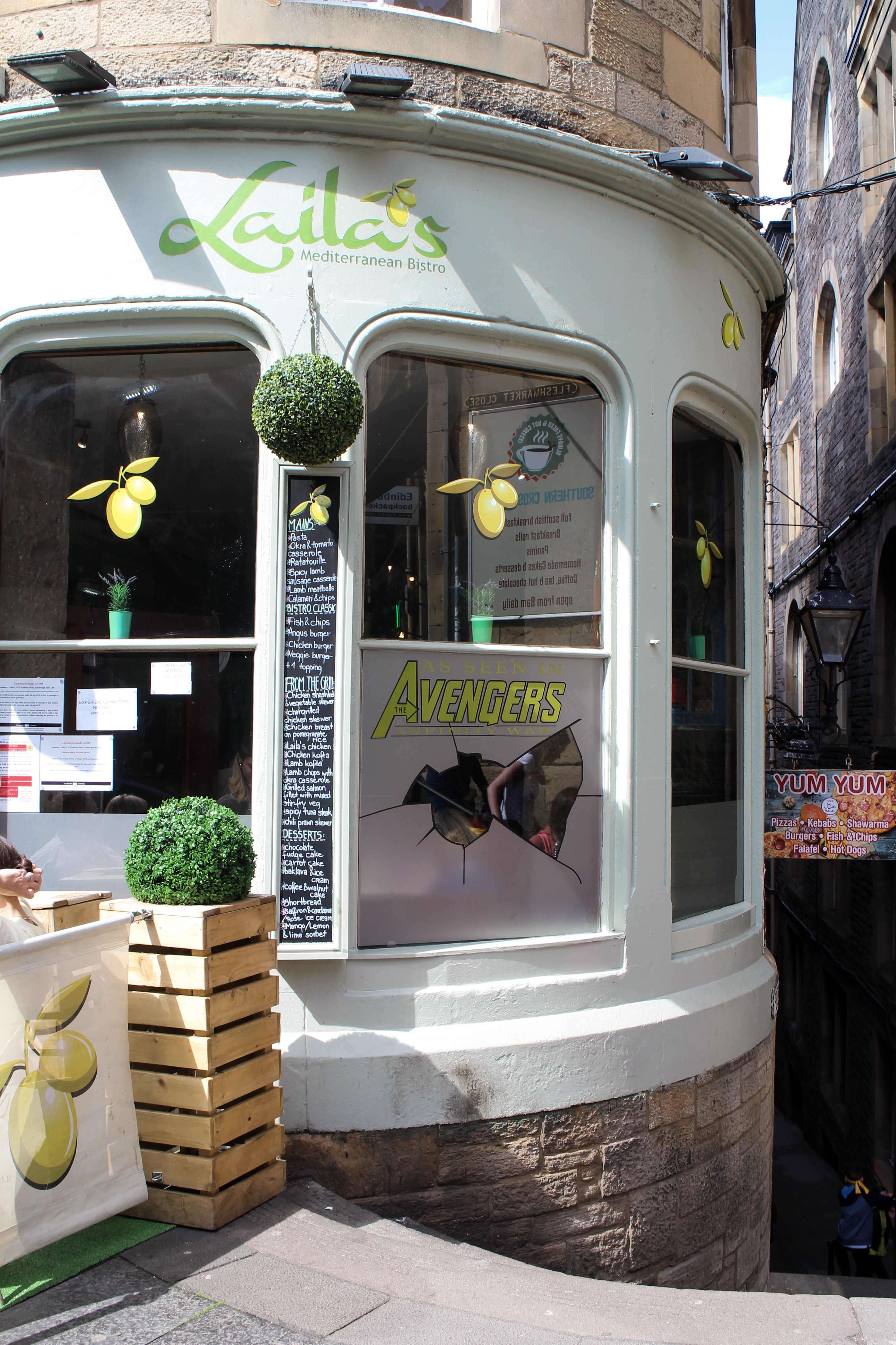 The start of Edinburgh’s feature in Infinity War features Scarlet Witch (Elizabeth Olsen) and Vision (Paul Bettany) watching a TV through the window of a takeaway. In reality this isn’t the case (there isn’t a, “we will deep fry your kebab” sign) and it’s actually a shop called Miss Katie Cupcake, a little trinket and jewellery store. Across the road at Laila’s, a Mediterranean restaurant, there is a window showing off the fact that Avengers was filmed there. In the film, Scarlet Witch can be seen standing in it, before flying off with Vision.