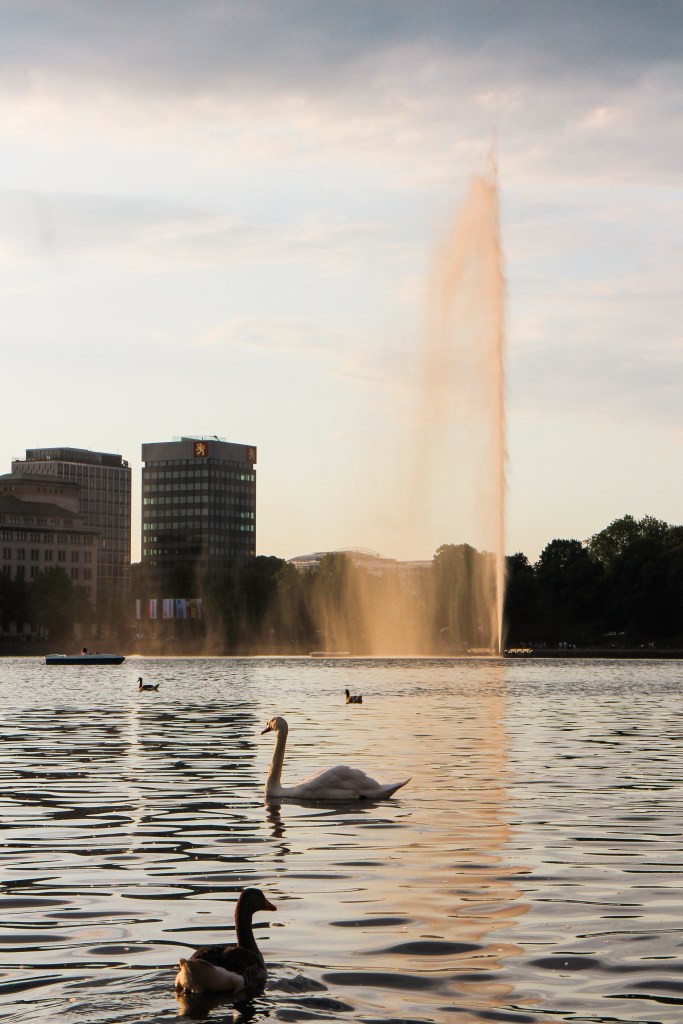 After spending an hour or two shopping, the calm after the storm arrived in the most beautiful, golden form. We picked up some post-dinner snacks and drinks and sat looking out to the Alster fountains. It seemed like a popular spot for tourists and locals alike because the shore was fairly busy but the bustling crowds gave the area a lovely atmosphere and we had a lovely time sitting and talking about our trip so far with the odd visit from swans and ducks.