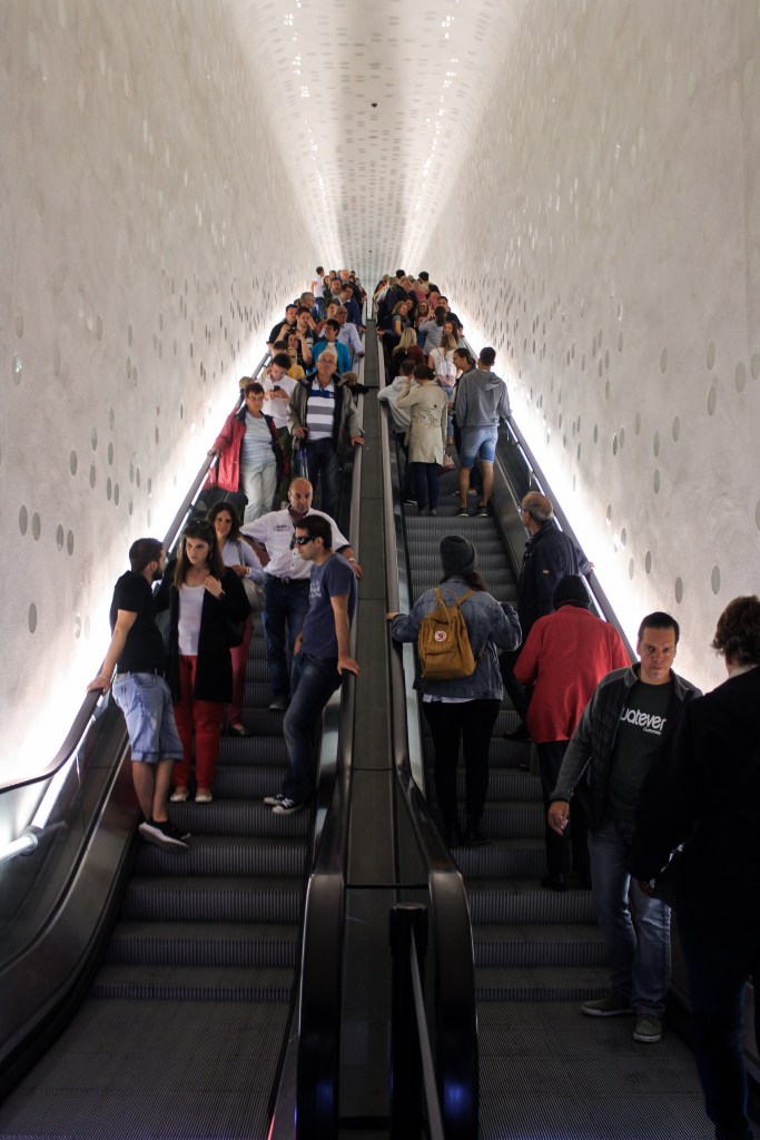 There’s a short wait time to get a free ticket but you can visit the viewing platform to see across the port. The escalator is quite long but it’s so beautifully curved that I was in awe of it the entire time. The view from the platform is fab I just wish it had been blue skies when we visited.