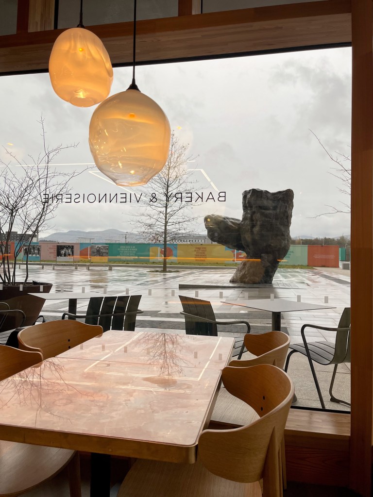 The open bakery fits really well into the space and it’s wonderful to watch your pastries transport from oven to counter quickly. The marble tables were my favourite with their peachy tones that complemented the ceramic crockery beautifully. With such large windows, I can imagine Patina filled with light on a sunny morning, unfortunately, it was just a gloomy Wednesday for my trip. Edinburgh Park, where Patina is located, seems to be undergoing a lot of development in recent years. Whilst in general, there isn’t a lot to do besides having some excellent pastries, there are quite a few sculptures dotting about which I had a nosey round for a little stretch of my legs. I’ll be back to Patina for more breakfast, lunches and dinner and maybe even for one of their jazz nights because I can’t imagine a dreamier setting for the music.